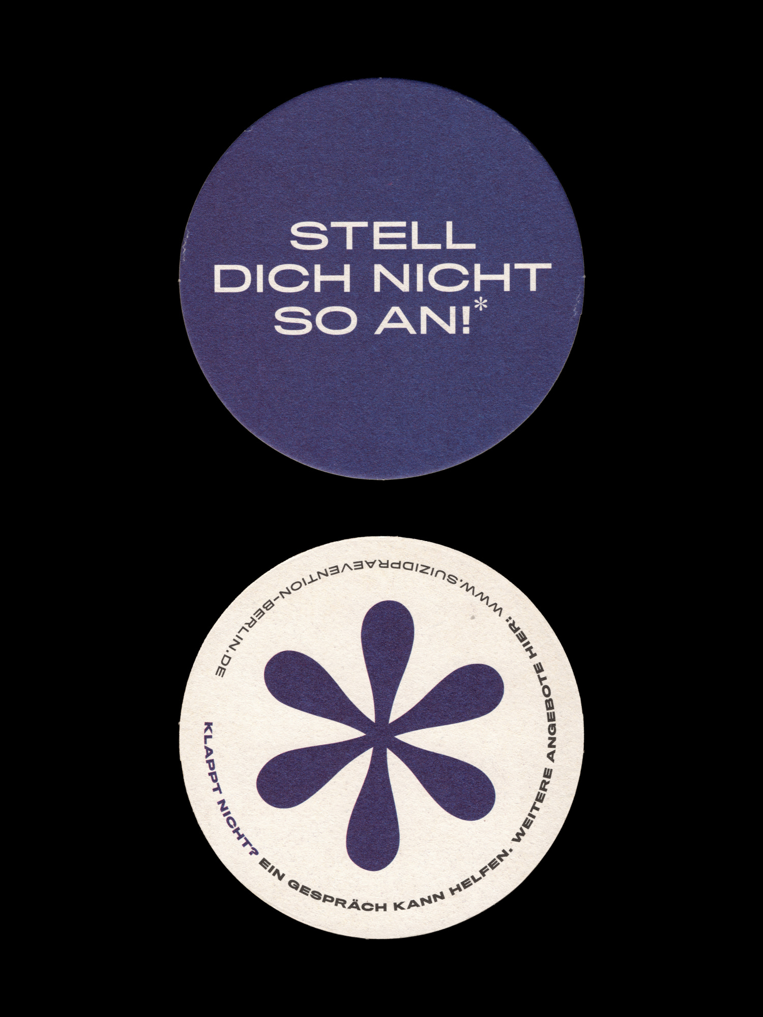 The 10th of September is the World Suicide Prevention Day. Regard to this day, a small Out of Home campaign was created for the Caritas Association Berlin in cooperation with u25 Germany. The choice of coasters as a medium transports the topic into the society in an informal, easy way. Ironic and unhelpful phrases on the one side meet a serious and genuine offer opportunity to talk about the topic on the other. The goal is to de-taboo the topic of suicide and to encourage people to have open conversations and to seek help. (telephone counselling service, available 24 hours a day, 0800 1110111)