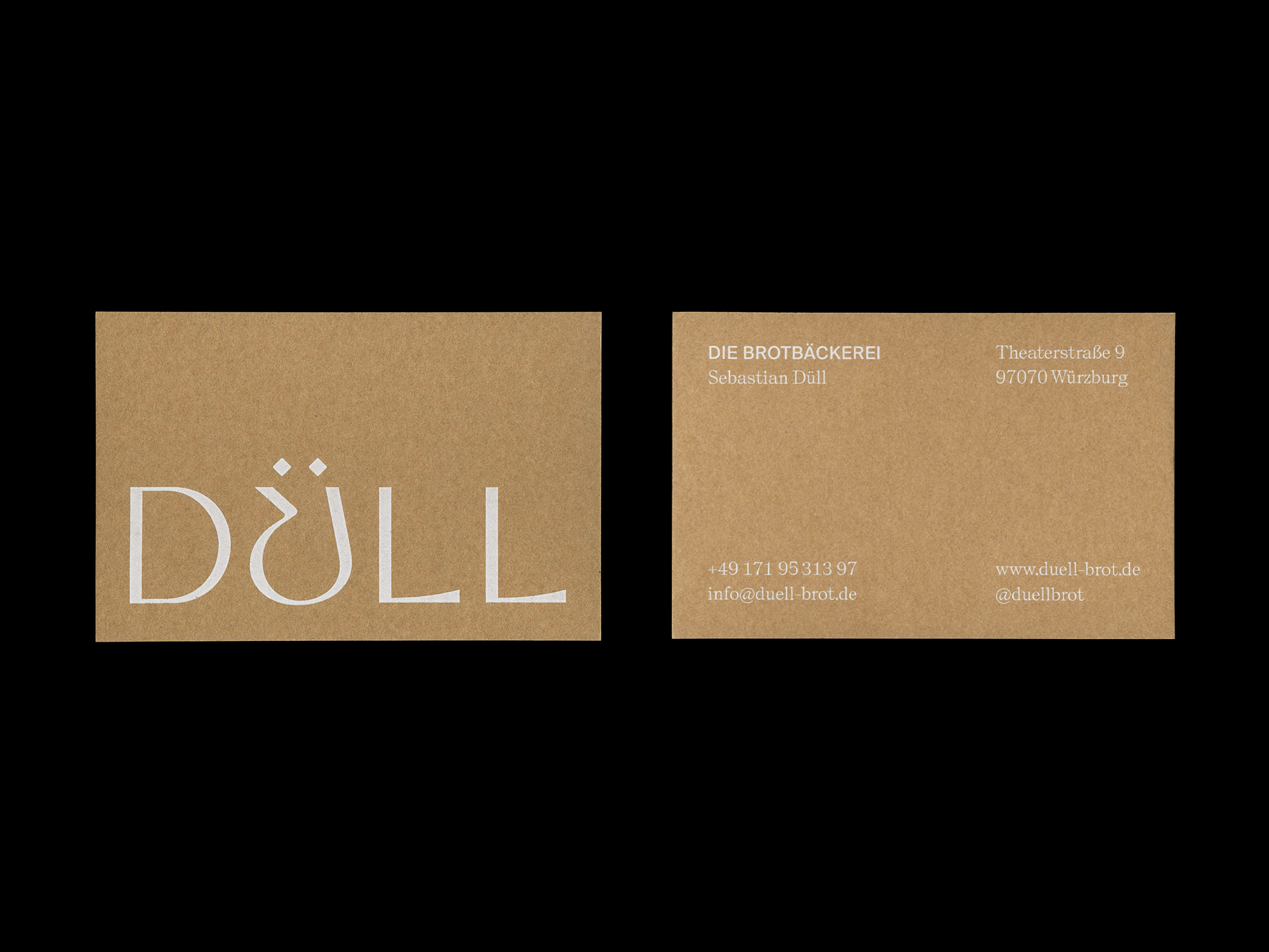 Düll is a bakery in Würzburg that offers a very reduced product range: six different kinds of bread. The presentation of these breads takes the central role of the branding. Through six photos, the story of each product is told, and the taste and character of every individual bread is visualized. The appearance is complemented by an eye-catching word mark, which is used on all other designed media, such as shop windows, packaging, business cards and carrier bags.