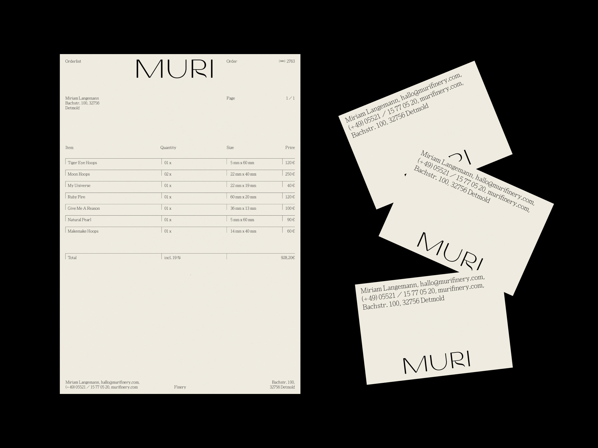 A corporate design, which express high quality and timelessness has been created for Miriam Langemann, also known as Muri, the founder of the label Muri Finery. The focus is on delicate craftsmanship and durable materials. A custom-made font was created for the brand.